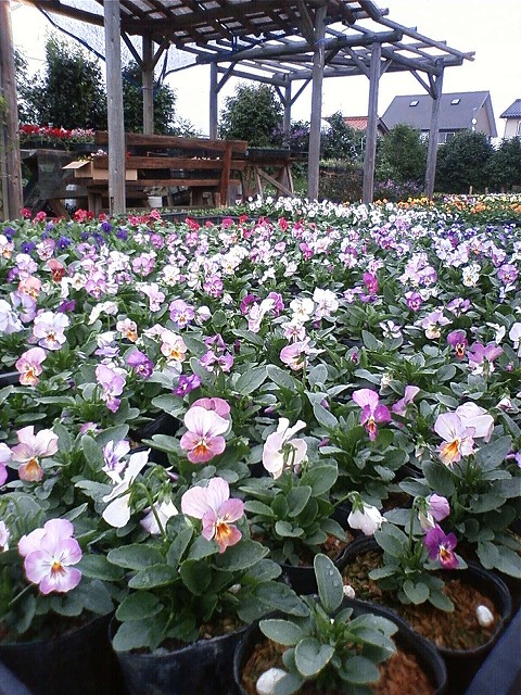 カメリアさんのパンジーやビオラが咲き始めていました。