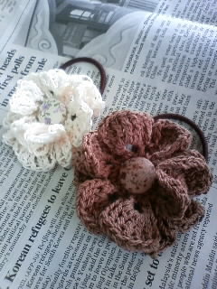 お二人でのお申し込みでお花のヘアゴムを編まれました。