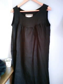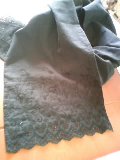 黒いリネンのワンピース、黒いボーダーレースのストール。