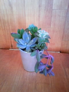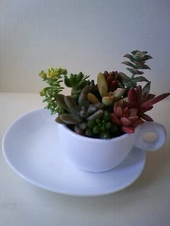 ティーカップとアルミカップに入った多肉植物。